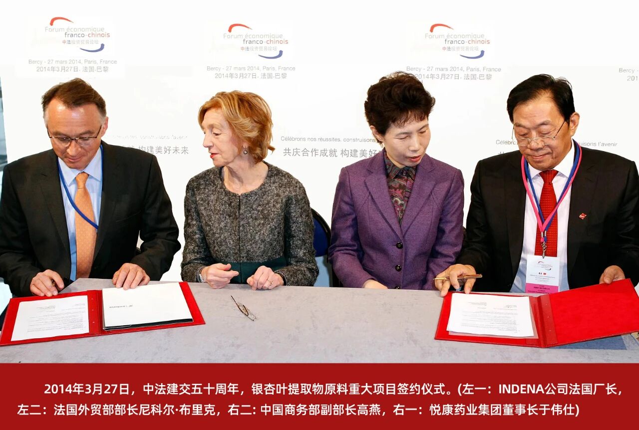 2014年,中法建交五十周年之际,在中法两国政府领导见证下,悦康药业与INDENA集团签署中法医药合作备忘录